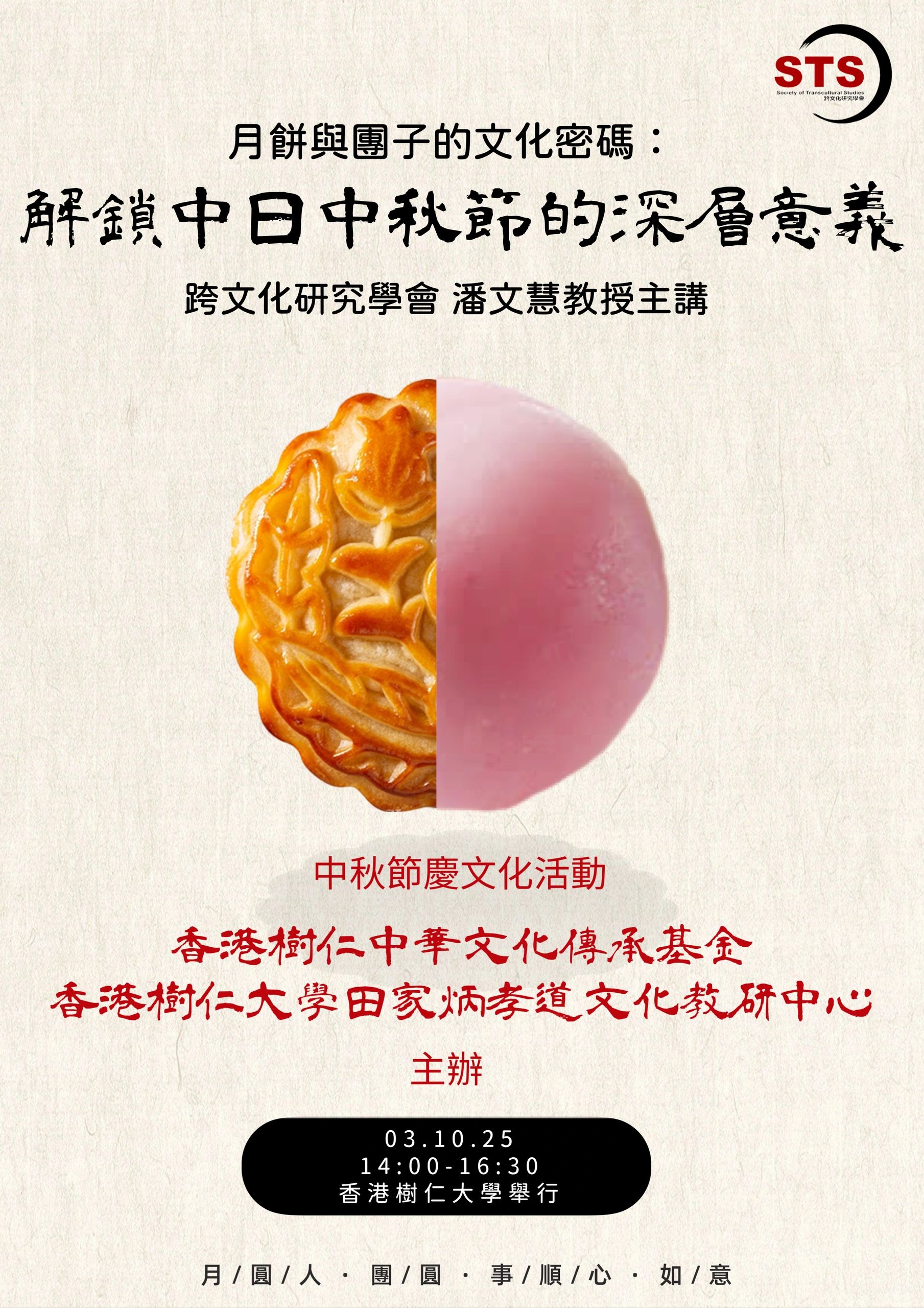 中秋月圓,但文化各異。為何中國人以豐腴的月餅追求團圓,而日本人卻以素白的團子靜觀明月?跨文化研究學會 會長潘文慧教授將以「月餅與團子的文化密碼」為題,引領大家跨越餐桌,進行一場深度的文化解謎。潘教授將從這兩種象徵性食物入手,解讀中日文化在家庭倫理(孝道)、自然觀、審美意識乃至時空觀念上的深層差異,揭示節慶飲食背後豐富的文化意涵與民族精神。